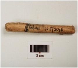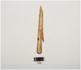 | Description / विवरण | Bone harpoon with one pointed barb, polished surface, square in section and partly broken from both ends cream in colour |