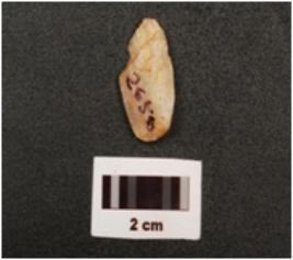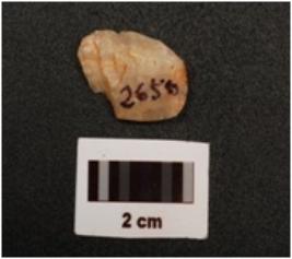 | Description / विवरण | A quartz end struck flake, negative bulb on ventral side and partly broken at one end |