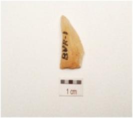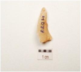 | Description / विवरण | A utilized flake made on quartz with single ridge and cortex on dorsal, triangular section and use wear marks on edges. |