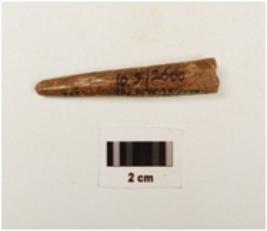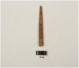 | Description / विवरण | A bone point with polished surface, pointed end and partly broken from both ends circular in section and light brown in colour |