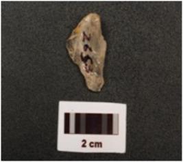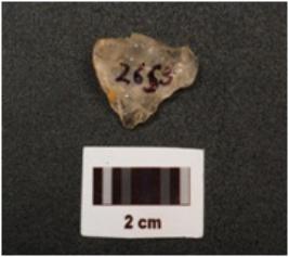 | Description / विवरण | Quartz end struck flake with striking platform, diffused bulb ob ventral side and use wear marks on one edge, |