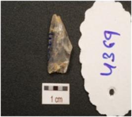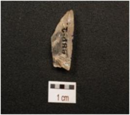 | Description / विवरण | A flake made on quartz crystal, flake scars on surface and prepared platform. |