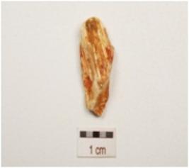 | Description / विवरण | A flake made on fossil wood, prepared platform and flake scars on surface. |
