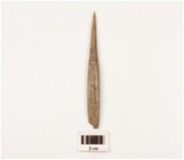 | Description / विवरण | Long bone point, slightly damaged at one end, pointed at one end and flat at other one. |