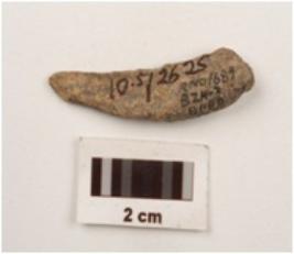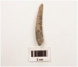 | Description / विवरण | Curved bone point, pointed at one side and blunted at other rough surface. |