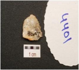 | Description / विवरण | A scraper made on quartz , prominent bulb on ventral side, use wear marks on working edge, prepared platform and flake scars on dorsal side. |