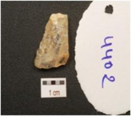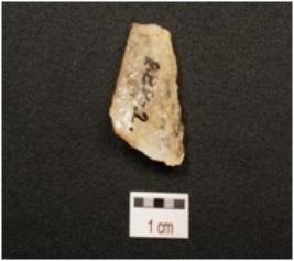 | Description / विवरण | A scraper made on quartz crystal, prepared platform, flake scars on dorsal side, prominent bulb on ventral side and use wear marks on working edge. |