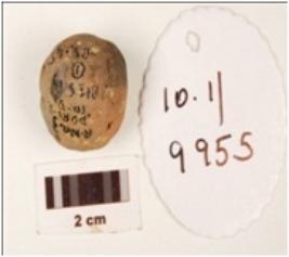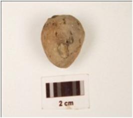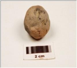 | Description / विवरण | A handmade terracotta sling ball with pin holes on the surface, uneven surface. |