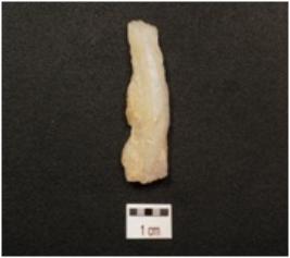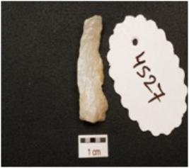 | Description / विवरण | A blade made on quartz, ridge on dorsal side, broken on both ends and use wear marks along cutting edge. |