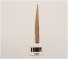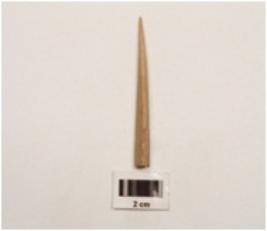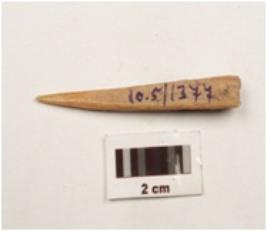 | Description / विवरण | A small bone point, with end is pointed and brown in colour, cracks on surface, triangular base and cross section. |