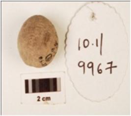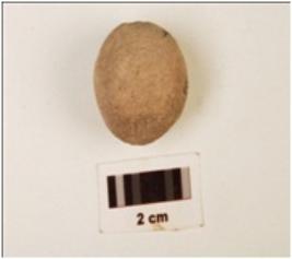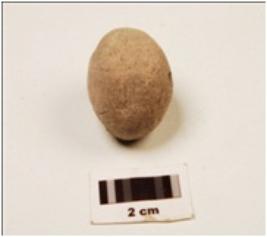 | Description / विवरण | Terracotta sling ball with nail impression on the surface, traces of mica particles visible on the surface. |
