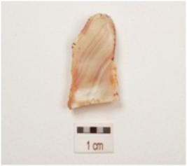 | Description / विवरण | A flake made on agate, blade scars on dorsal side, broken on proximal end, cortex visible on ventral side and use wear marks along cutting edge. |