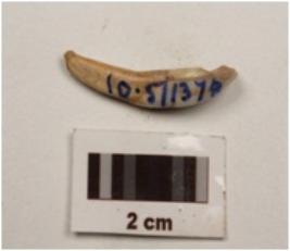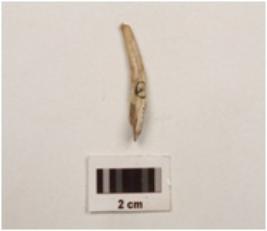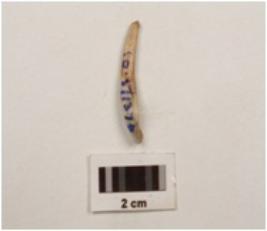 | Description / विवरण | A modified bone object with pointed ends, cracks on surface, smooth and brown in colour, slightly curved. |