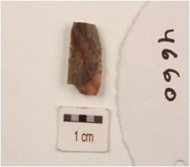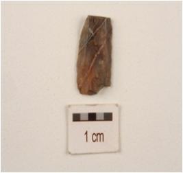 | Description / विवरण | Fragment of parallel sided chert blade, two ridges on dorsal surface, trapezoidal in section, retouches along cutting edges, smooth surface. |