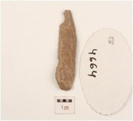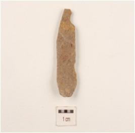 | Description / विवरण | Blade made on end struck chert flake, flake scars on dorsal surface, partly broken from one side use wear marks along cutting edges, positive bulb on ventral surface. |