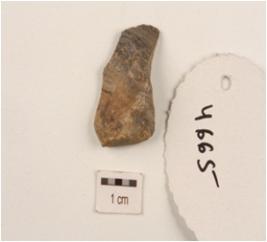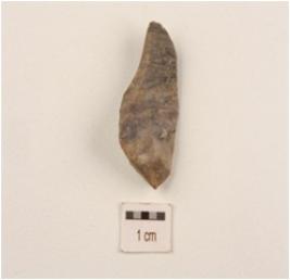 | Description / विवरण | Flake made on end struck chert flake, flake scars on dorsal surface, prominent bulb on ventral surface, use wear marks along cutting edges. |