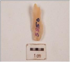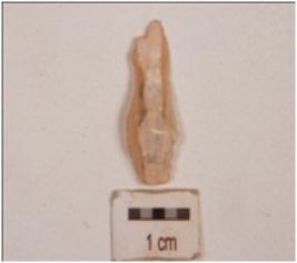 | Description / विवरण | An end struck chalcedony flake, prepared platform, diffused bulb on ventral side, cortex on dorsal side, use-wear marks along sharp edge. |