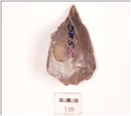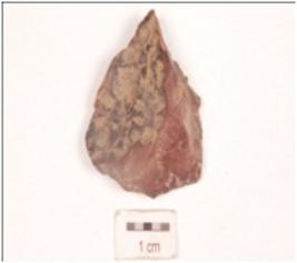 | Description / विवरण | An end struck flake on chert, unprepared platform, diffused bulb on ventral side, use-wear marks along sharp edges. |