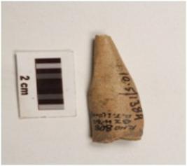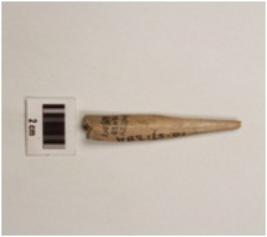 | Description / विवरण | A bone point with pointed ends, crack marks on surface, brown in colour and grooved base. |