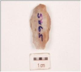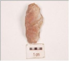 | Description / विवरण | A side scaraper made on an end struck chert flake, prepared platform, diffused bulb on the ventral side, flake scars on dorsal side partly broken convex cutting edge with use wear marks. |
