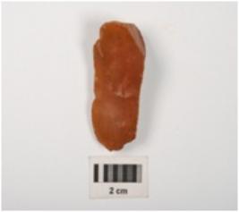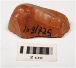 | Description / विवरण | Side scraper prepared on chert core with two blade scars and cortex on dorsal, diffused bulb on ventral and use wear marks on cutting edges. |