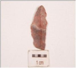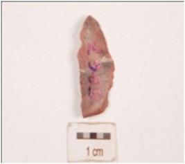 | Description / विवरण | An end struck chert flake, unprepared platform, diffused bulb on ventral side, ridge on dorsal side, use-wear marks along sharp edges. |