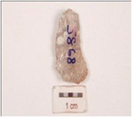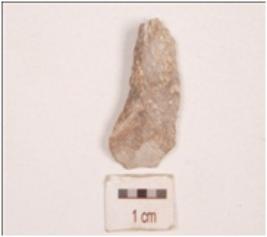 | Description / विवरण | Flake made on chert, blade scars on dorsal side, bulb and platform absent, use-wear marks along cutting edges. |