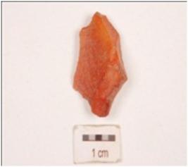 | Description / विवरण | Side scraper made on carnelian, prepared platform, prominent bulb on ventral side, partly broken convex cutting edge, with use-wear marks. |
