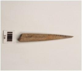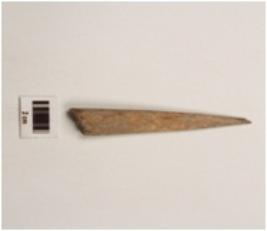 | Description / विवरण | A bone point with pointed end, rough surface and dark brown in colour. |