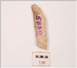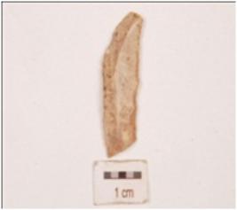 | Description / विवरण | Fragment of a parallel sided blade made on chert, broken along both the ends, bulb and platform absent, triangular in section, retouches and use-wear marks along cutting edges. |