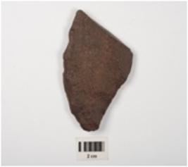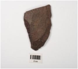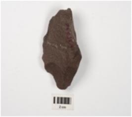 | Description / विवरण | Side scraper made on basalt stone with prepared platform, flake scars on dorsal and irregular retouches on left cutting edge. |