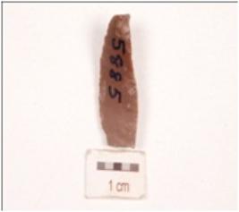 | Description / विवरण | Fragment of a parallel sided blade made on an end struck chert flake, prepared platform, diffused bulb on ventral side, partly broken distal end, blade scars on dorsal side, partly chipped off, use-wear marks along sharp edge. |