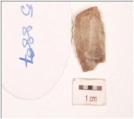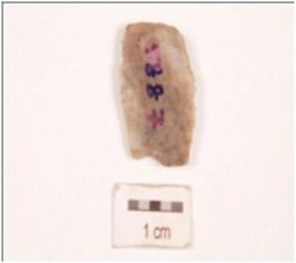 | Description / विवरण | Fragment of a parallel sided blade, made on an ends struck chert flake, prepared platform on proximal end, prominent bulb on ventral side, four blade scars on dorsal side, partly broken distal end, use-wear marks along both the sharp edges. |