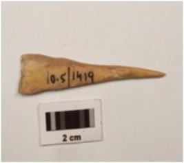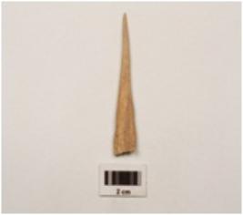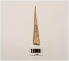 | Description / विवरण | A bone point, ends are pointed, cracks are visible, smooth surface, brown colour and grooved on bottom. |