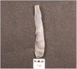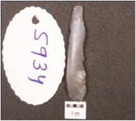 | Description / विवरण | Chalcedony crusted ridged blade made on flake, flake scars on the dorsal side, prominent bulb on the ventral side, prepared platform on the proximal end, intact use wear marks on the cutting edge. |