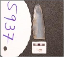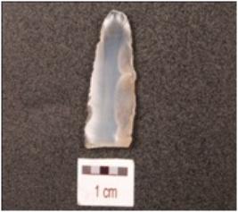 | Description / विवरण | Chalcedony blade made on flake scars on the dorsal side, prominent bulb on the ventral side, prepared platform on the proximal end, intact use wear marks on the cutting edge. |