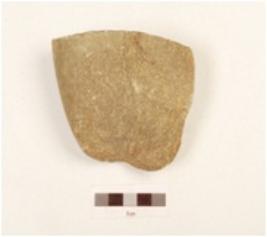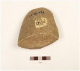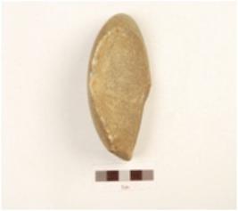 | Description / विवरण | A chopper made on quartzite pebble, visible cortex, flat butt end at posterior end, broken at anterior end, oval section. |