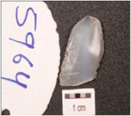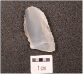 | Description / विवरण | Flake made on chalcedony, flake scars on the dorsal side, prominent bulb on the ventral side, prepared platform on the proximal end, use wear marks along with the cutting edges. |