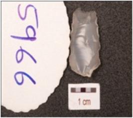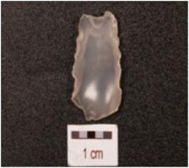 | Description / विवरण | Chalcedony flake, flake scars on the dorsal side, prominent bulb on the ventral side, prepared platform on the proximal end, wavy cutting edges. |