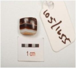 | Description / विवरण | A small rectangular banded agate bead perforation at the top and biconvex cross section. |