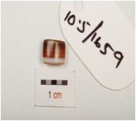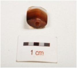 | Description / विवरण | A tiny rectangular banded agate bead, with smooth surface perforation on the top and biconvex cross section. |
