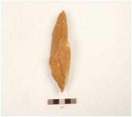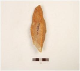 | Description / विवरण | Side scraper made on flake, few flake scars visible on surface, one side broken, triangular cross section. |
