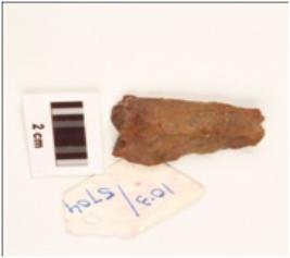 | Description / विवरण | Flake stone tool made by chert, two blade scars on the surface, prepare platform proximely, irregular shape. |