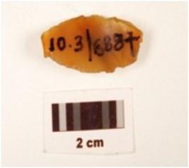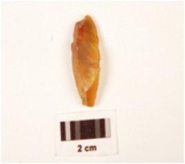 | Description / विवरण | A single ridged chalcedony blade, smooth surface, flake scars on one side, prepared platform, ripple marks on the surface, retouching along the edges. |