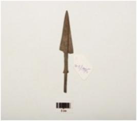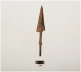 | Description / विवरण | Copper arrow head with tang, flat surface pointed top and slightly damage. |