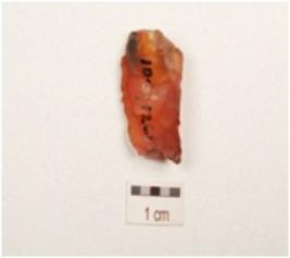 | Description / विवरण | Fragment of blade made on carnelian with mid ridge on dorsal, bulb on ventral, prepared platform, triangular in section wear marks on cutting edge and broken along distal end. |