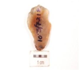 | Description / विवरण | A side scraper made on end struck chalcedony flake, prepared platform, prominent bulb on ventral side, blade scars on dorsal and convex cutting edge with retouches. |