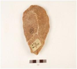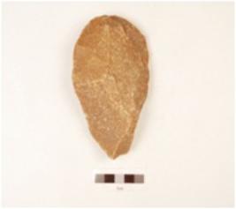 | Description / विवरण | A quartzite hand axe made on end struck flake, flake scars on the surface, bulb missing prepared platform on the proximal end, pear shaped, biconvex-cross section, wavy cutting edges. |