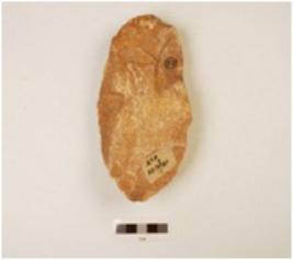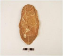 | Description / विवरण | A quartzite hand axe made on side struck flake, flake scars on the surface, platform on the proximal end bulb missing, plano convex-cross section, wavy cutting edges. |