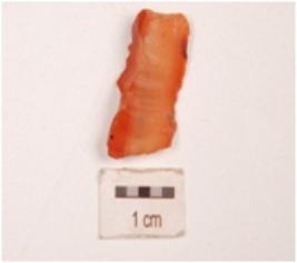 | Description / विवरण | Fragment of a blade on carnelian flake, blade scars on dorsal side and sharp cutting edge with retouches. |